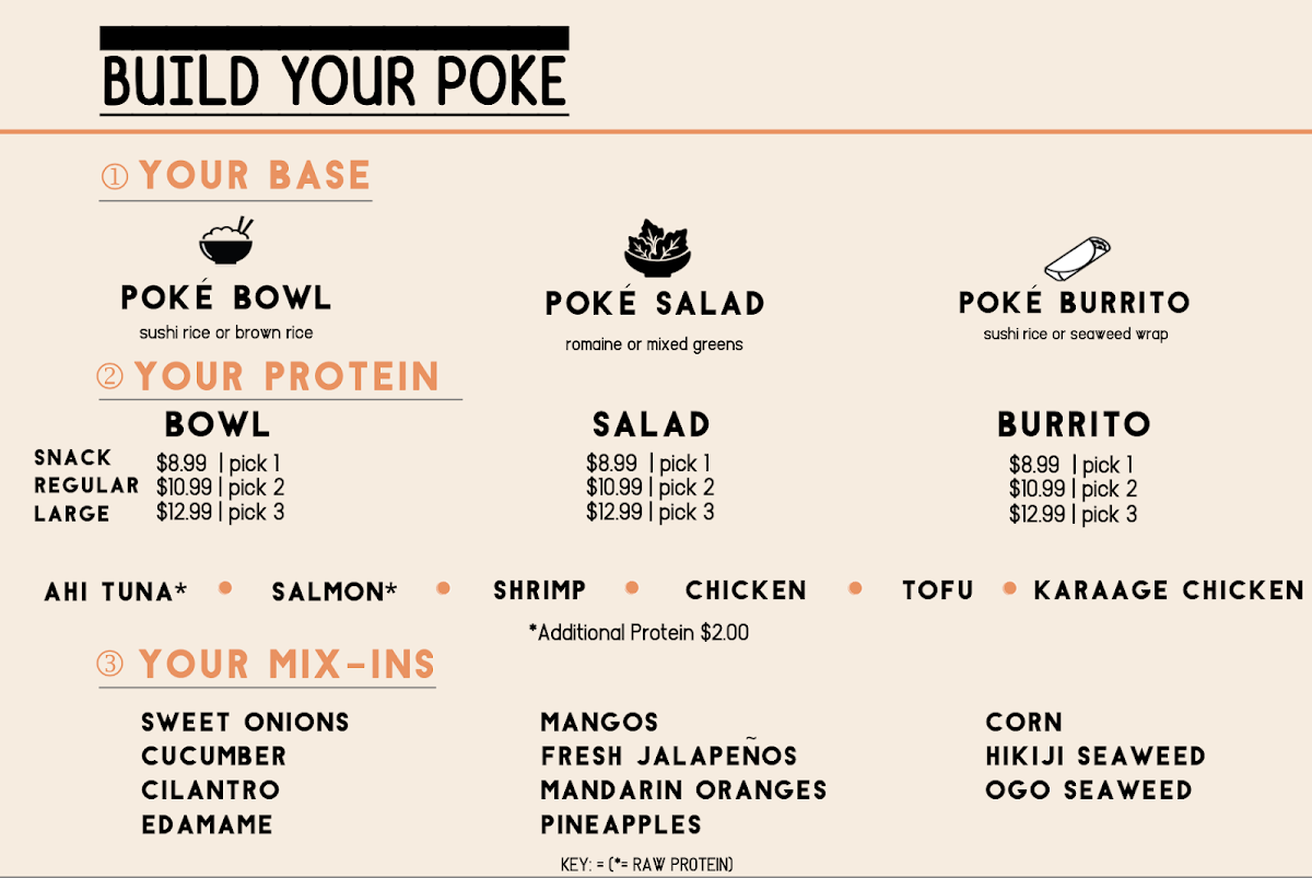 Create your own Poké Bowl! Choose your base, proteins, mix-ins, flavor, toppings, and crunch. One protein choice
