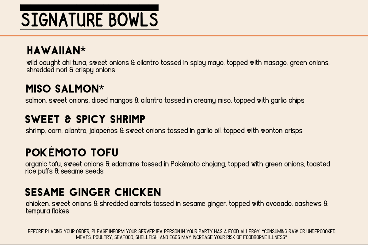 Pokémoto in New Haven offers a vibrant and diverse menu that caters to various tastes, with an emphasis on fresh, flavorful ingredients. Their Signature Bowls are a standout, featuring the Hawaiian Bowl with its perfect balance of tropical flavors, the savory Miso Salmon Bowl, and the zesty Sesame Ginger Chicken Bowl. For those looking for a plant-based option, the Pokémoto Tofu bowl provides a delicious alternative, while the Sweet and Spicy Shrimp bowl offers a mouthwatering combination of bold and sweet flavors.