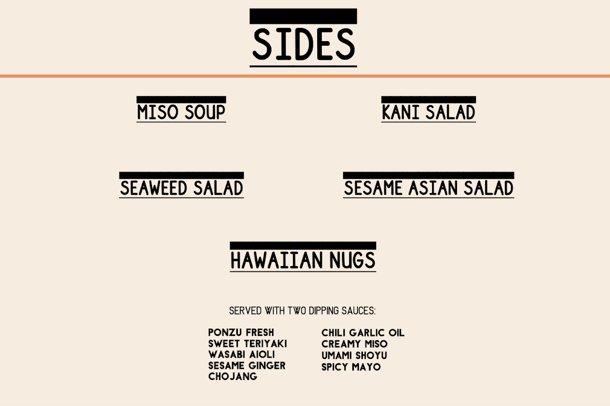 For those looking to complement their meal, Sides like the refreshing Sesame Asian Salad, flavorful Seaweed Salad, and comforting Miso Soup provide a perfect addition. The crispy Hawaiian Nugs and the savory Kani Salad are also great choices to add a little extra to your meal.